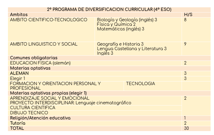 El PDC está orientado a la consecución del Título de Graduado en ESO y abarca los cursos 3º y 4º ESO. Sus materias están agrupadas en ámbitos, cada uno de los cuales está impartido por el mismo docente. El grupo de este Programa es menos numeroso y recibe clases de un menor número de profesores/as, lo que permite una mejor acción tutorial e individualización del proceso de aprendizaje.